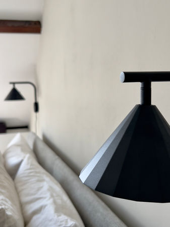 There is a quiet focus on the use of textures and natural textiles. The modern minimalist design of the bedside lamps is softened by the gently curved headboard, and both are complimented by the classic curves of the Thonet chair.